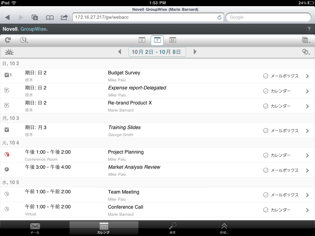 をタップして、表示するカレンダを選択する。メインのGroupWiseカレンダの他に、パーソナルカレンダまたは共用カレンダを表示できます。