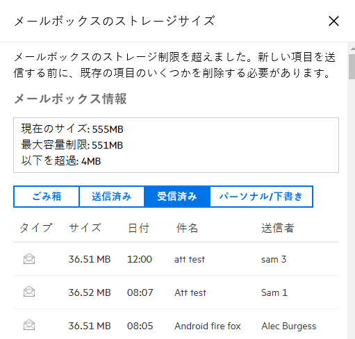 視覚的なインジケータに加えて、ゲージアイコンをクリックすると、メールボックスサイズを直接開くことができます。ログアウト中に受信メールが「赤色」のストレージステータスになった場合、ログイン時にこのダイアログボックスが自動的に開きます。ダイアログボックスの上部に表示される情報は、制限を超えていることを通知するもので、メールボックスの項目が制限を下回るように十分な項目数がパージされるまでメールを送信できません。