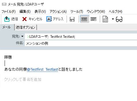 以下に示す例では、メッセージ作成者が宛先フィールドに「LDAPユーザ」を追加し、メッセージ本文でこのユーザを「Sir」と呼んでいます。最初の文を入力しているときに、メッセージ作成者は「@test」と入力し、名前補完のアドレス帳ポップアップリストから「TestFirst TestLast」ユーザを選択することができました。この最後のアクションでは、リンクされた受信者の名前がメッセージ本文に挿入され、そのユーザがメール項目の宛先フィールドに追加されました。