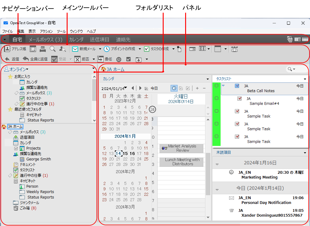 GroupWiseにおける主な作業領域は、[メインウィンドウ]です。メインウィンドウでは、メッセージを読む、アポイントのスケジュール、カレンダの表示、連絡先の管理、GroupWiseの実行モードの変更、フォルダの表示、ドキュメントの表示など、さまざまな作業を行うことができます。