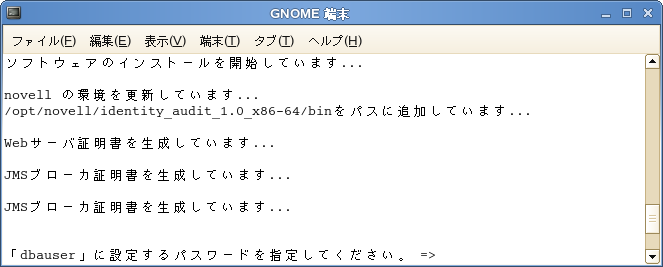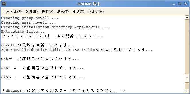 ログアウトした後にnovellユーザとしてログインし直します。この操作により、install.shスクリプトで実行されたPATH環境変数の変更の内容がロードされます。