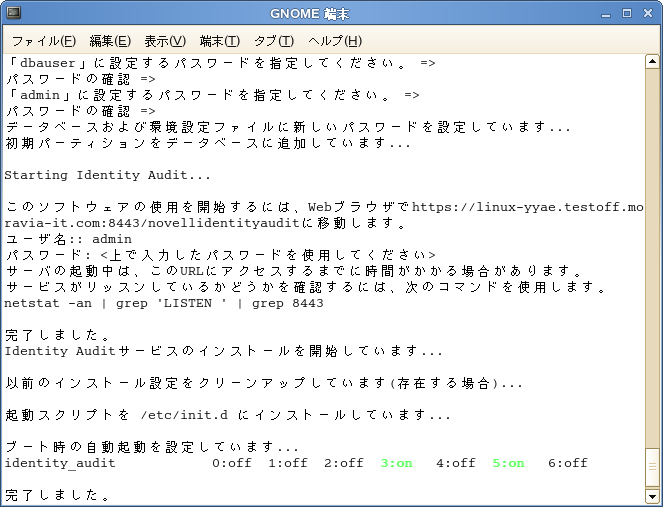 dbauserの資格情報を使用して、PostgreSQLデータベースにテーブルとパーティションが作成されます。Identity Auditは、ランタイムレベル3および5 (コンソールで起動するマルチユーザモードまたはX-Windowsモード)で起動するように設定されます。