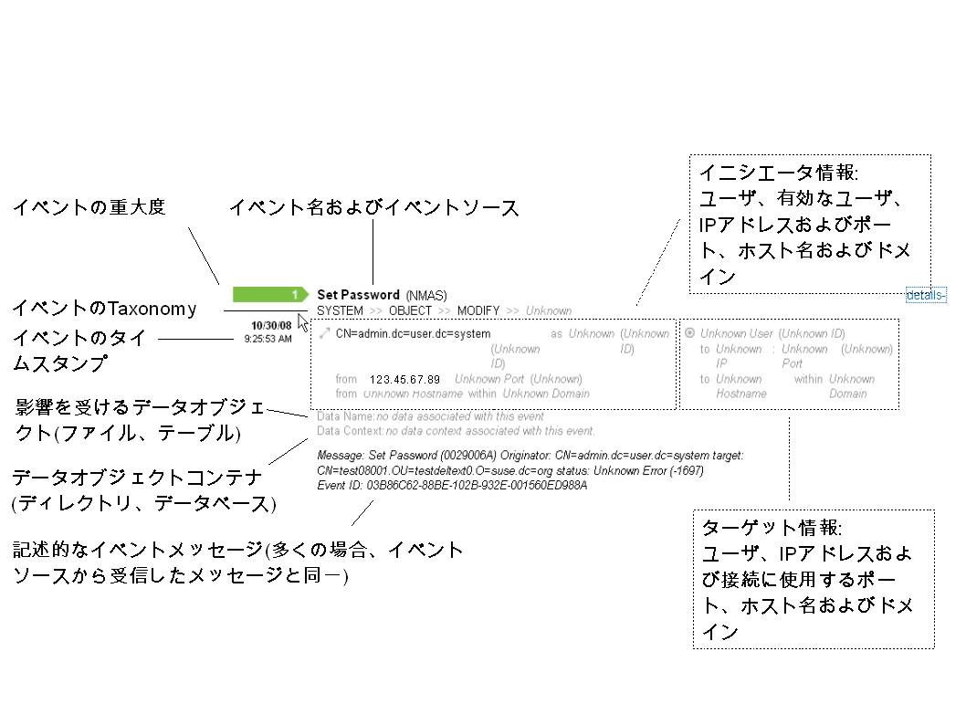 基本的なイベント情報としては、イベント名、ソース、時間、重大度、イニシエータに関する情報(矢印アイコンで表示)、ターゲットに関する情報 (ブルズアイアイコンで表示)などがあります。