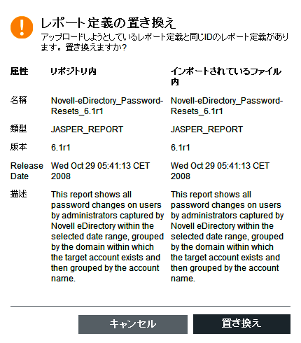 ユーザは既存のレポートの代わりに、更新されたレポートをIdentity Auditにアップロードして置き換えることができます。詳細については、セクション 5.4.1, レポートの追加を参照してください。
