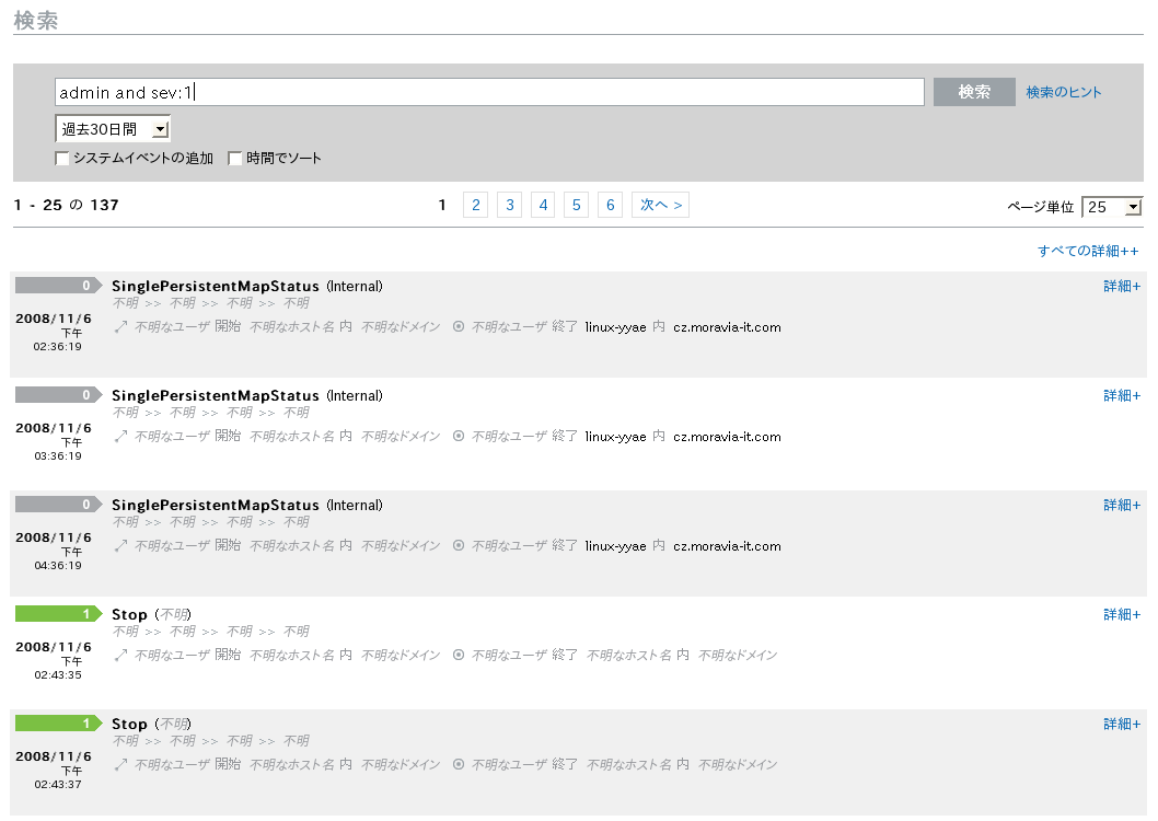 別の条件で検索を行うには、検索フィールドに検索条件を入力します(たとえばadmin)。この検索では大文字と小文字は区別されません。