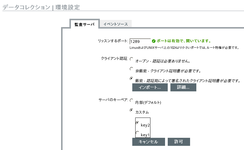 イベントソースはSSL接続を経由してデータを送信し、Identity Auditサーバの[クライアント認証]設定では、イベントソース上のプラットフォームエージェントから受信した証明書に対して実行する認証の種類を決定します。