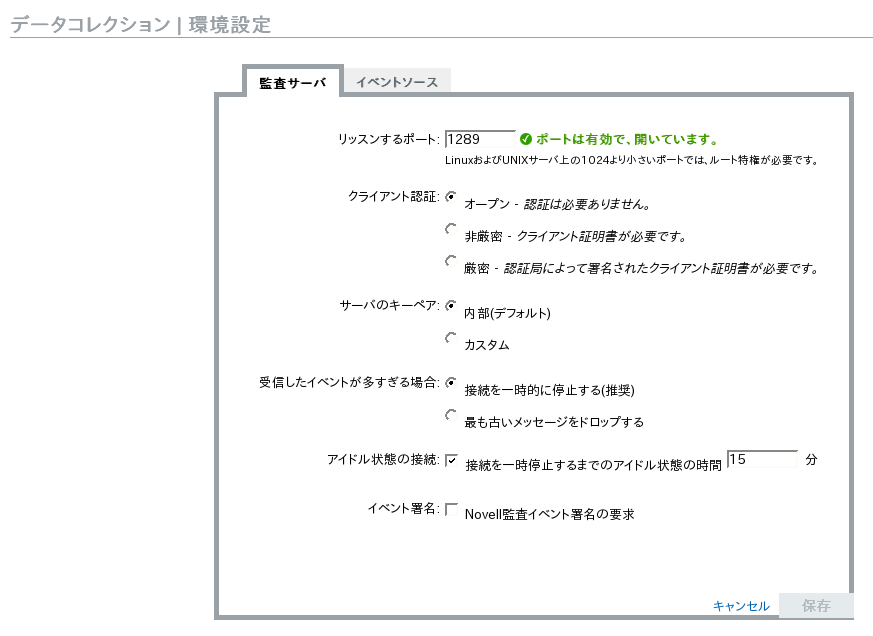 管理者は、Identity Auditがリッスンするポートや、イベントソースとIdentity Audit間の認証のタイプなど、Identity Auditがイベントソースのアプリケーションからデータをリッスンする方法に関して、設定を変更することができます。