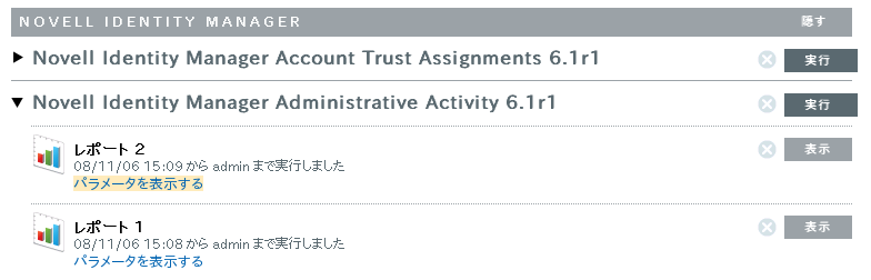 レポート結果のリストを表示するには、[表示]をクリックします。 以前実行されたすべてのレポートが、ユーザが定義したレポート名と、レポートの実行ユーザ、およびレポートの実行日時とともに表示されます。