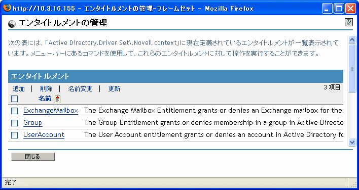 有効化されたエンタイトルメントを持つActive Directoryドライバには、3つのエンタイトルメント(ユーザアカウント、グループ、およびExchangeメール)が付属しています。
