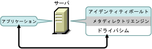 メタディレクトリエンジンはeDirectoryプロセスの一部として実行されます。Identity Managerドライバは、メタディレクトリエンジンを実行しているサーバで実行できます。実際に、これらはメタディレクトリエンジンと同じプロセスの一部として実行できます。