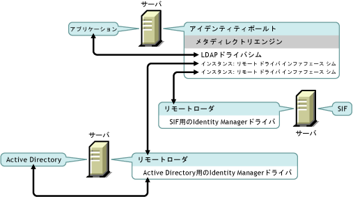 接続システムにはリモートローダが必要です。このサービスにより、メタディレクトリエンジンは、次のように、異なるプロセスとして異なる場所で実行しているIdentity Managerドライバとデータを交換できます。