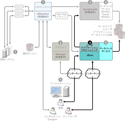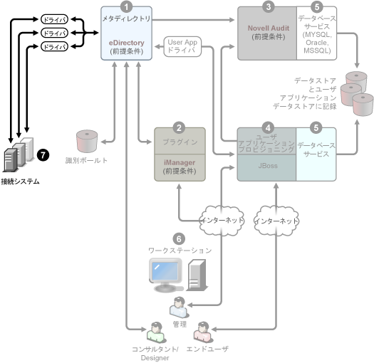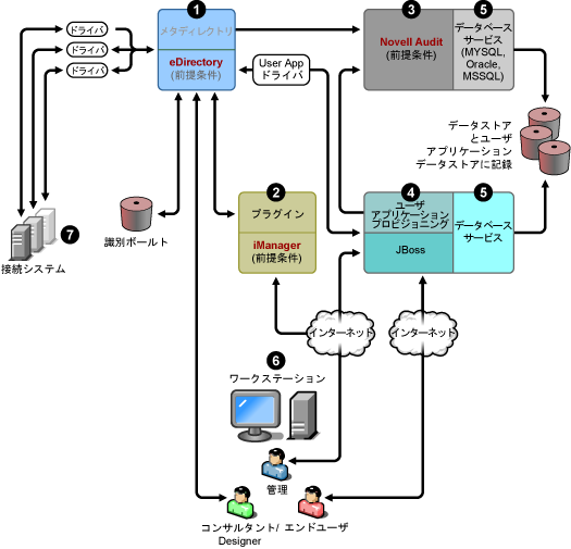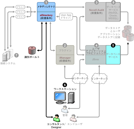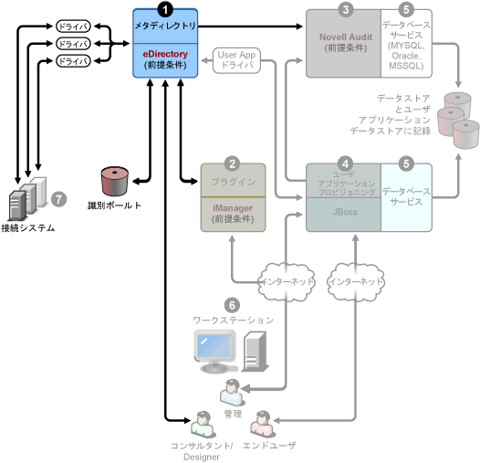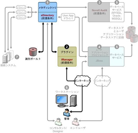 メモ:Identity Managerコンポーネントをインストールする前に、eDirectory 8.7.3以降、iManager 2.5以降、およびNovell Audit 1.0.3 Starter Packなど、あらかじめ必要なソフトウェアをインストールする必要があります。必要なソフトウェアは、ノベル用ダウンロードWebサイトから入手できます。