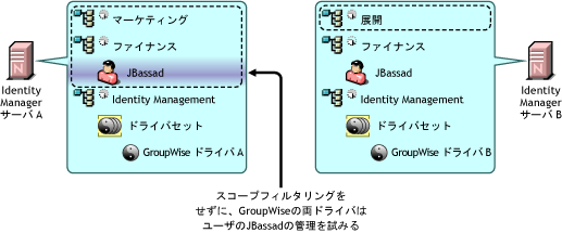 Server AとServer BはどちらもFinanceコンテナのレプリカを保持しているため、どちらのサーバもFinanceコンテナにあるユーザJBassadを保持しています。スコープフィルタリングを設定しないと、GroupWise Driver AおよびGroupWise Driver Bの両方によりJBassadが同期されます。