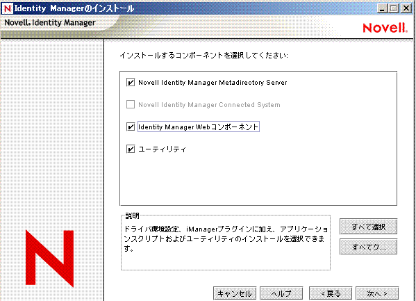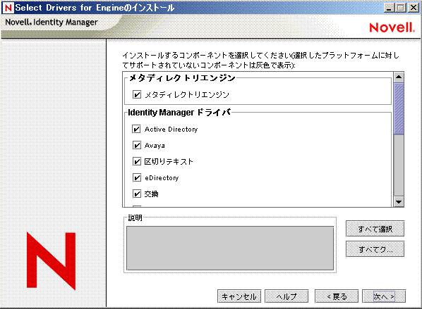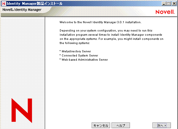 Novell eDirectoryは、このオプションをインストールする前にインストールする必要があります。メタディレクトリサーバコンポーネントは、Identity Managerのメタディレクトリエンジンを実行する場所にインストールします。