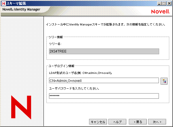 ユーザ名: eDirectoryスキーマを拡張する権限を持つユーザのユーザ名(Adminなど)を指定します(CN=admin,O=novellなどのLDAP形式)。