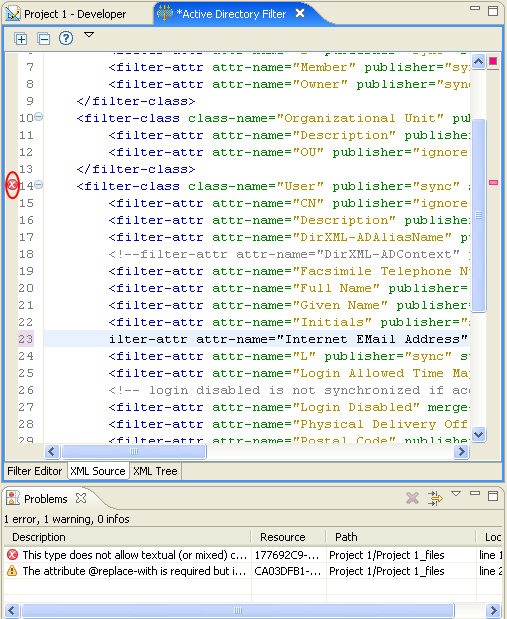 XMLエディタは、XMLコードを検証します。右クリックし、[検証]を選択します。エラーがある場合は、その行に赤の「x」が表示されます。ウィンドウの下部の説明に、問題についての詳しい情報が示されます。