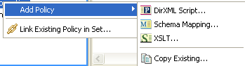 実装するポリシーのタイプを選択します。ポリシーのタイプは、デフォルトで[DirXML スクリプト]になります。DirXML®スクリプトを使用しない場合は、[XSLT]または[スキーマのマッピング]を選択できます。
