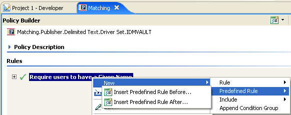 ポリシービルダ内を右クリックし、[New (新規作成)] > [Predefine Rules (事前定義されたルール)] > [Insert Predefined Rule Before (事前定義されたルールを前に挿入)]または[Insert Predefined Rule After (事前定義されたルールを後に挿入)]の順に選択します。