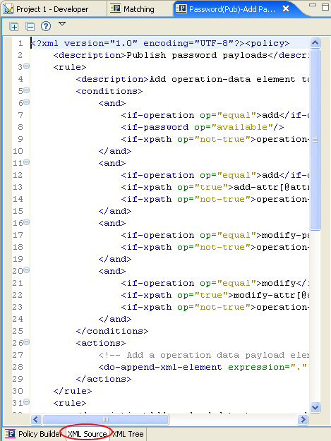 ポリシービルダのワークスペースの下部にある[XML Source (XMLソース)]をクリックします。