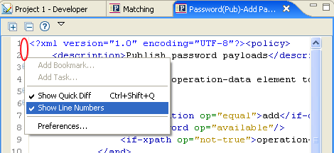 行番号を表示するには、左の余白を右クリックし、[Show Line Numbers (行番号の表示)]を選択します。