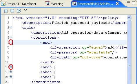 XMLエディタは、XMLを機能別に展開または縮小します。多くのXMLを含む機能が複数ある場合は、左上隅のマイナスアイコンをクリックして、XMLを縮小できます。