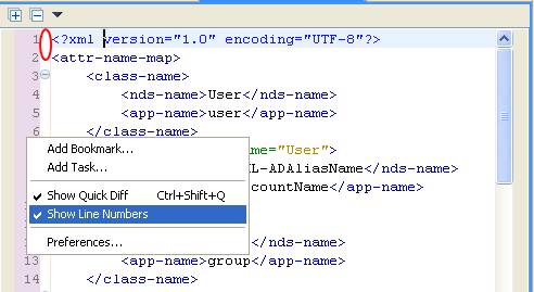 XMLエディタに行番号が表示されます。行番号を表示するには、左の余白を右クリックし、[Show Line Numbers (行番号の表示)]を選択します。