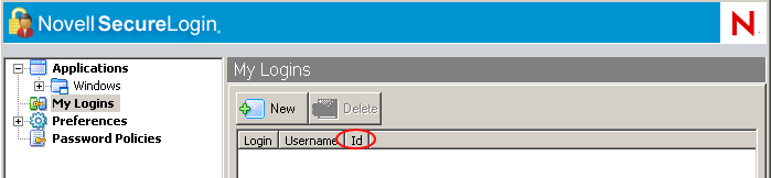 アプリケーションの認証キーを見つけるには、そのアプリケーションのユーザに対し、SecureLogin資格情報を手動作成し、そのユーザでログインします。ユーザがログインすると、SecureLoginの管理ウィンドウ内の[My Logins (マイログイン)]に、認証キー情報が表示されます。