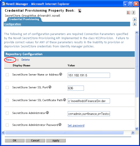 すべてのパラメータを決定したら、セクション 4.4.3, Novell SecretStoreのリポジトリオブジェクトの作成に進んでください。