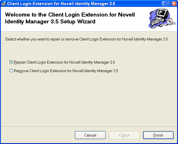 Novell Identity Manager 3.5用Client Login Extensionセットアップウィザードを再起動するには、Setup.exeを再度実行します。
