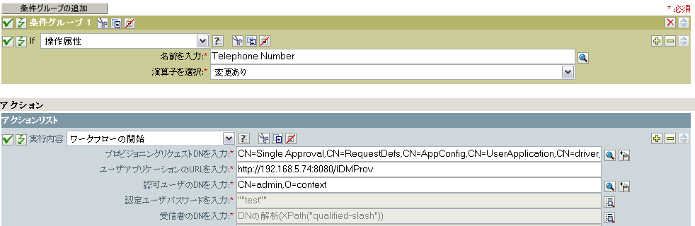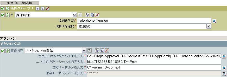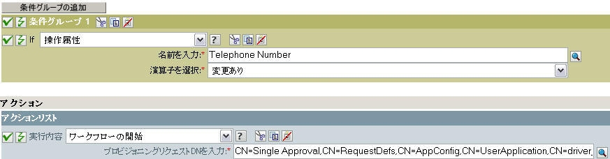 []リストでeDirectory属性を選び、その属性が変更された場合にワークフローを起動するようにします。次の例では、Telephone属性が選択されています。この場合、従業員の電話番号が変更されると、BusinessCardChangeワークフローが起動します。
