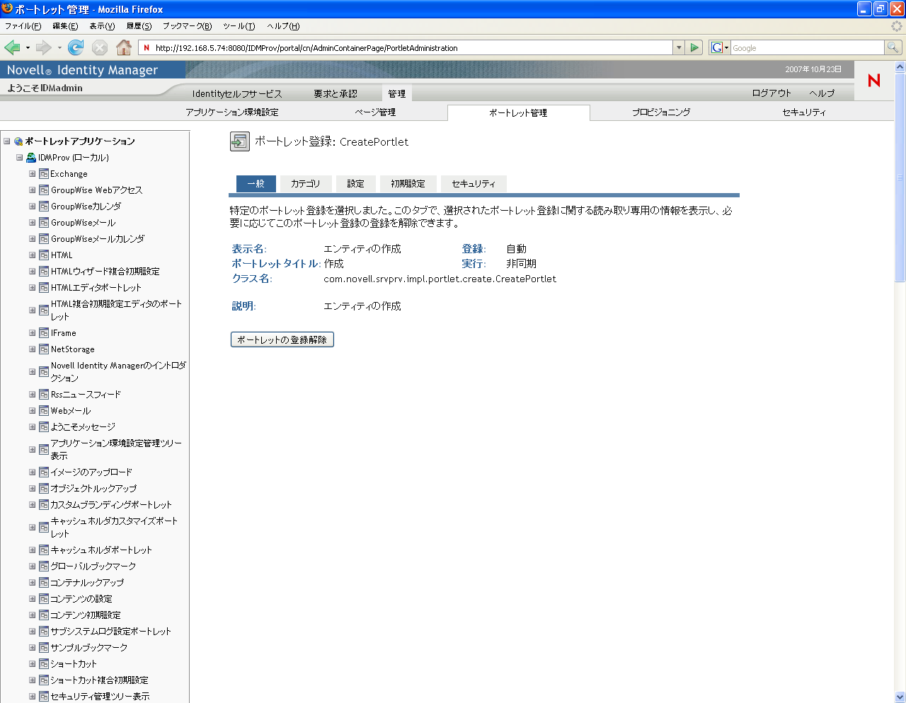 必要な場合は、[Portlet Admin]ページを使用してポートレットの登録を解除できます。