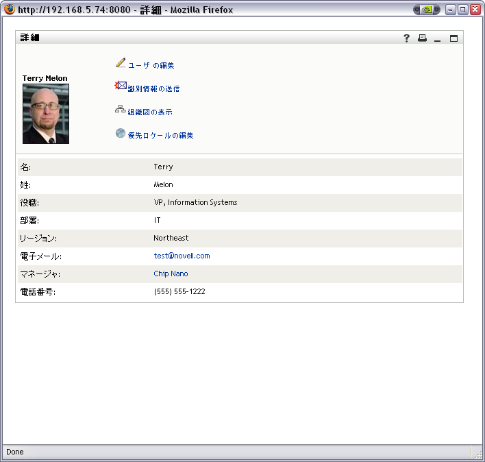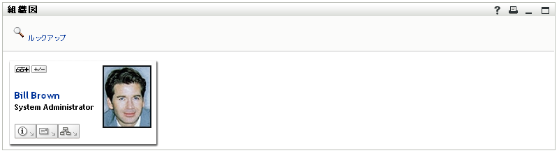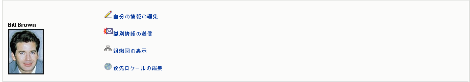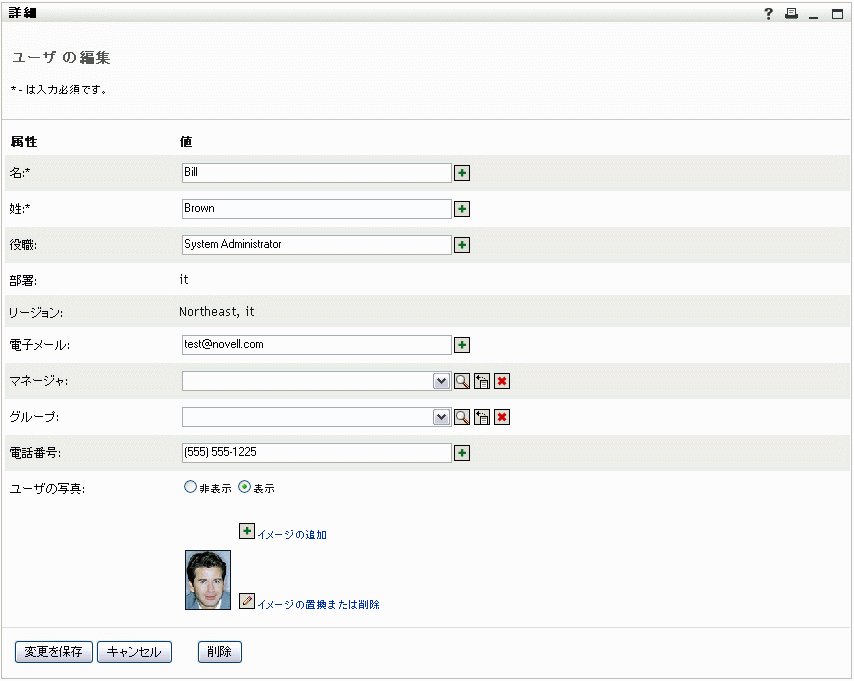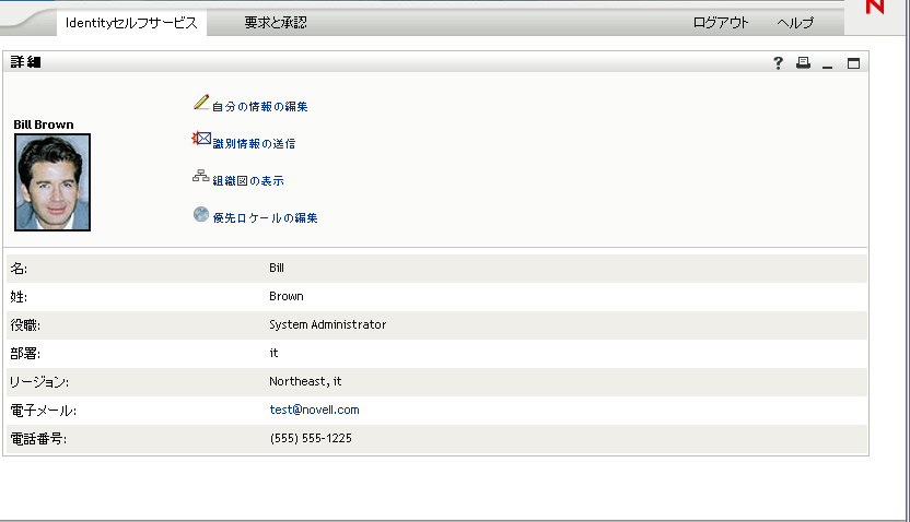 たとえば、(必要な権利を持っている)Bill Brownというユーザが自分自身の情報を編集するときに[Detail]ポートレットにより\'95\'5c示される内容は次のとおりです。
