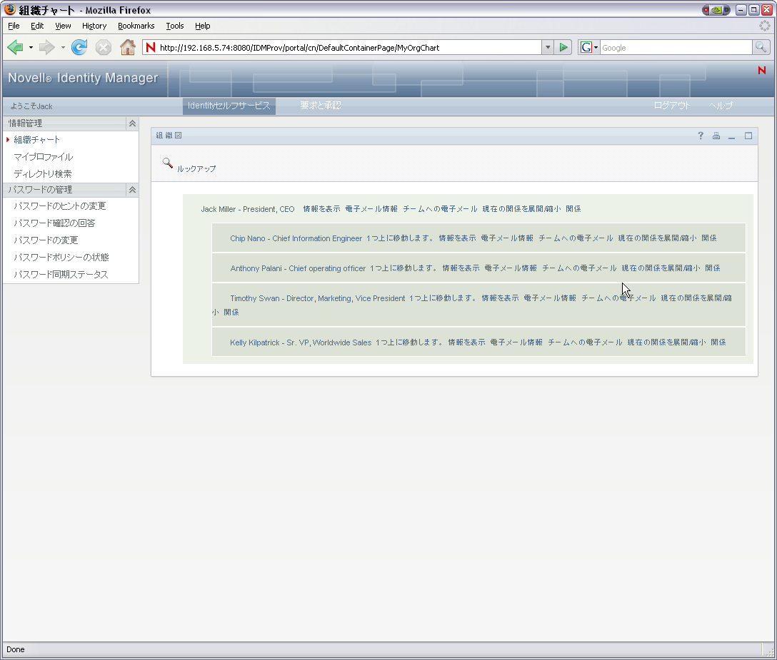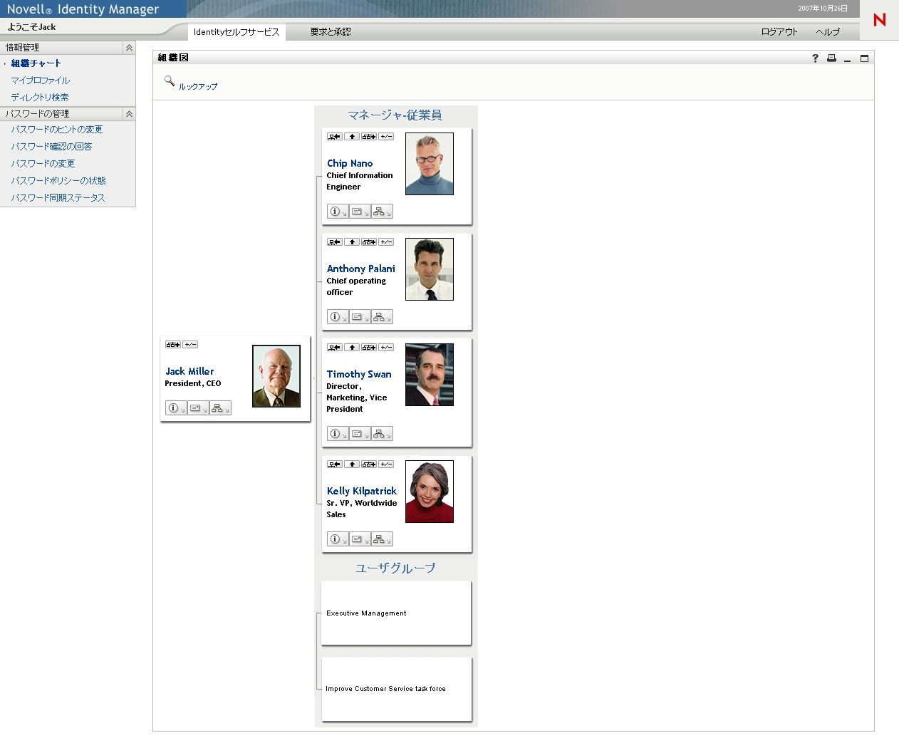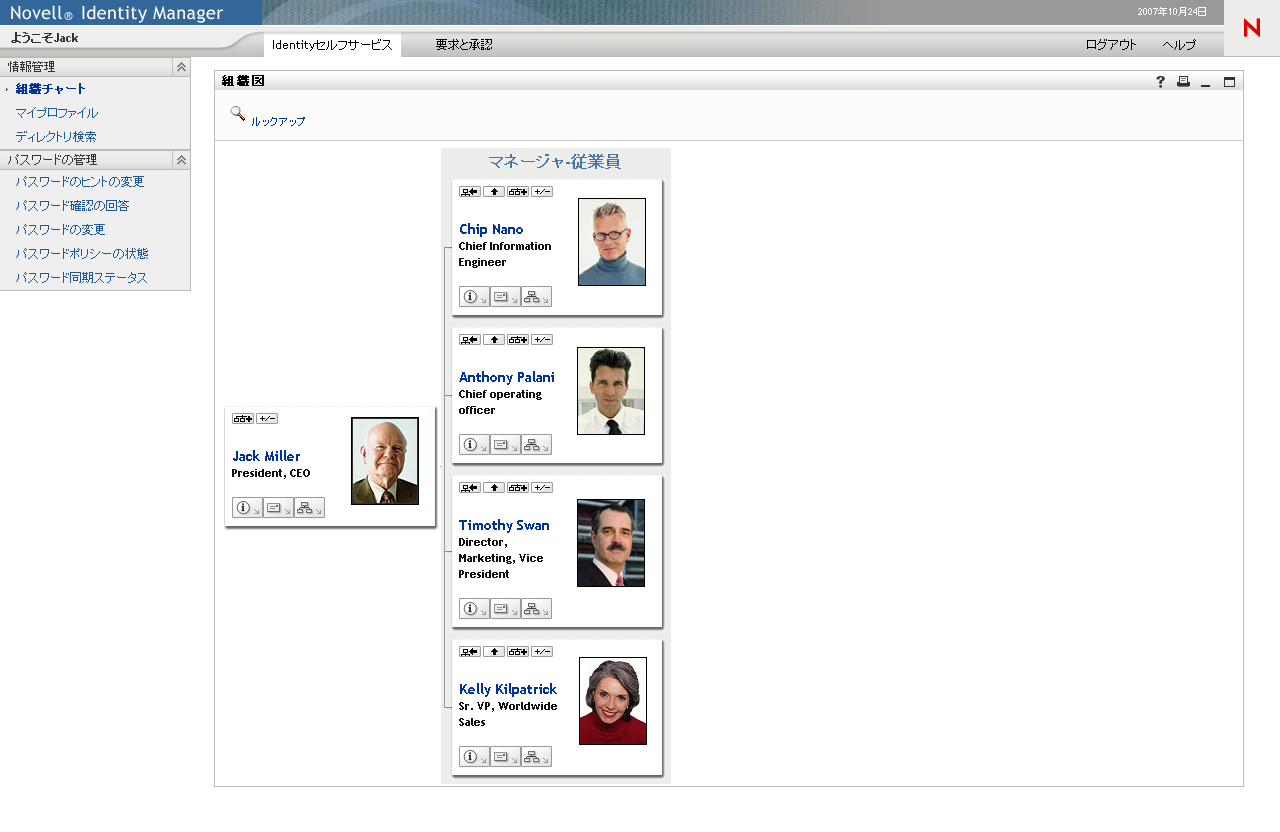 デフォルトでは、Identity Manageユーザアプリケーションのタブにはアクションが含まれています。このアクションは、アイデンティティボールト内のユーザオブジェクト間の関係を表示する組織図ポートレットです。次の例は、デフォルトの[Org Chart]ポートレットが(サンプルデータを使用して)この関係をレンダリングする方法を示します。