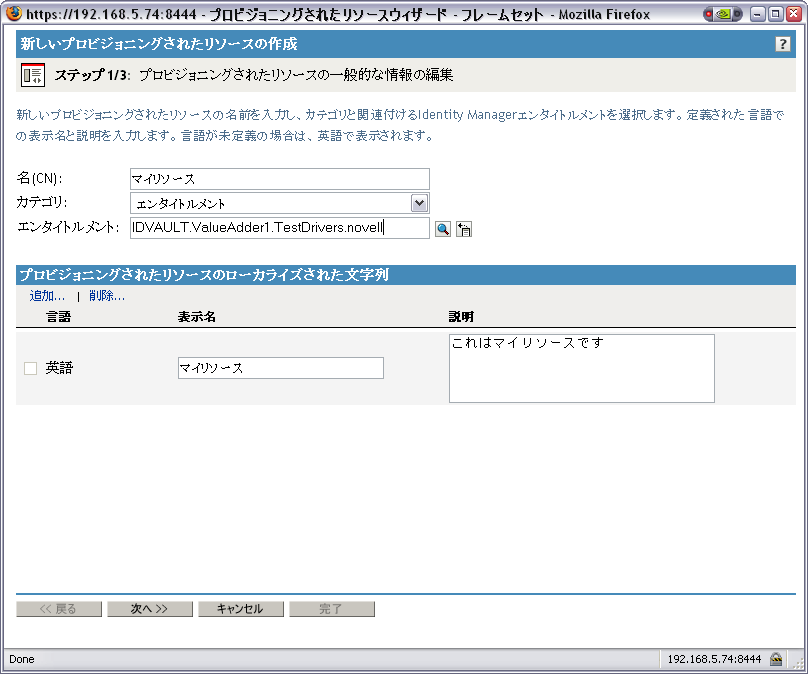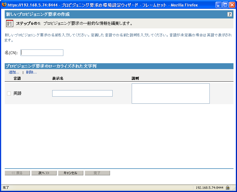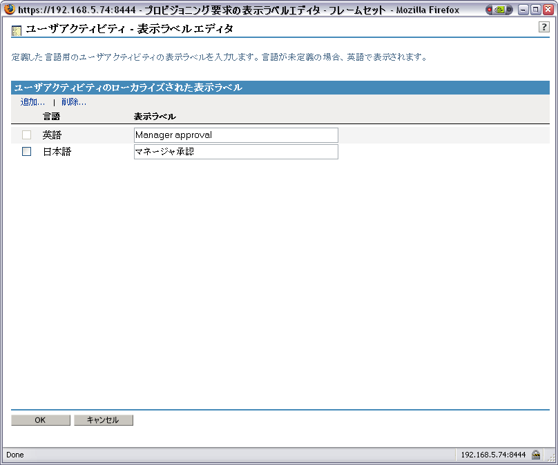 アプリケーションでサポートする各言語について、のおよびの各フィールドにローカライズされたテキストを入力します。このテキストは、ユーザアプリケーションにおけるプロビジョニング要求の識別に使用されます。