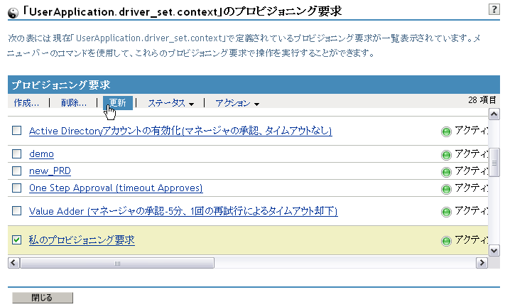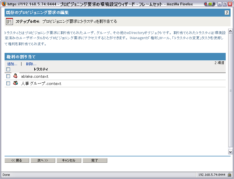 名前の横にあるチェック\'83\'7bックスをオンにし、権利を定義するプロビジョニング要求を選択します。