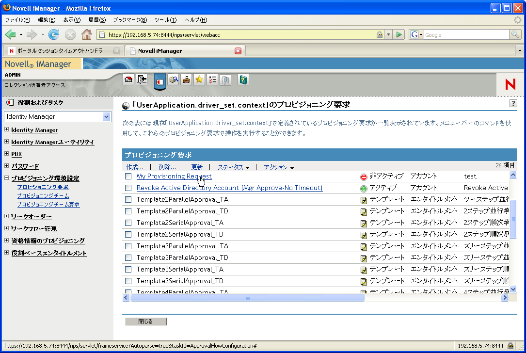 [プロビジョニング要求の環境設定]パネルが表示されます。[Provisioning Request Configuration]パネルには、使用できるプロビジョニング要求定義のリストが\'95\'5c示されます。