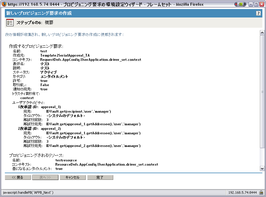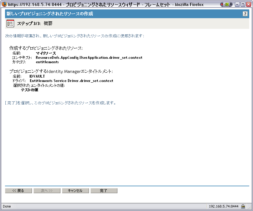 [Create New Provisioned Resource]ウィザードに[Summary]ページが\'95\'5c示され、定義するリ\'83\'5cースについての情報が\'95\'5c示されます。