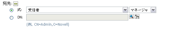 このボタンをクリックすると、ページに新しい[アドレス]セクションが表示されます。このセクションのコントロールを使って、宛先の式またはDNを定義することができます(この手順の次のステップで説明)。宛先を削除するには、宛先の隣にあるマイナス記号をクリックします。