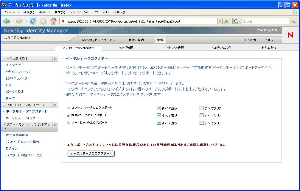 [ツール]ページを使用すると、Identity Managerユーザアプリケーションが使用するポータルコンテンツ(ページおよびポートレット)をエクスポート/インポートできます。このコンテンツはポータル設定状態としても知られ、次のものが含まれます。