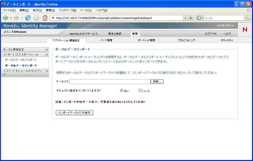 メモ:インポート中、ターゲットアプリケーションサーバは実行中で、またユーザ要求の処理中ではないことが必要です。