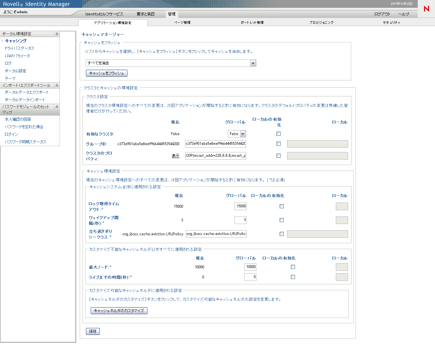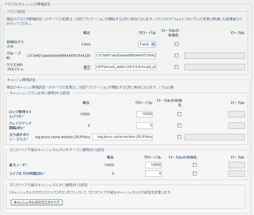 [キャッシング]ページを使用して、クラスタアプリケーションサーバ環境または非クラスタアプリケーションサーバ環境のキャッシュ環境設定を表示または変更できます。変更はただちに保存されますが、次回ユーザアプリケーションが再起動されるまで有効になりません。