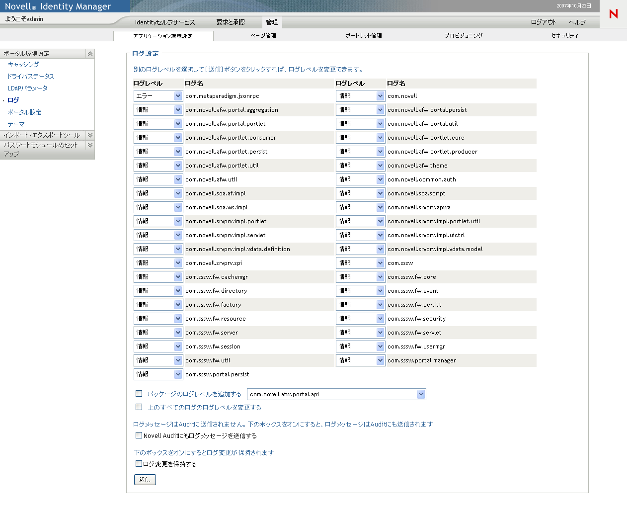 [ログ]ページを使用すると、Identity Managerユーザアプリケーションが生成するログメッセージのレベルを制御したり、これらのメッセージをNovell Audit®に送信するかどうかを指定したりすることができます。