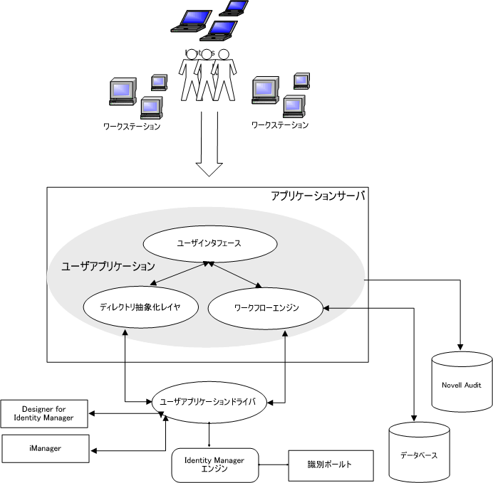 Identity Managerユーザアプリケーションでは、独立した複数のコンポーネントが連携して動作しています。主要コンポーネントを図 1-1に示します。