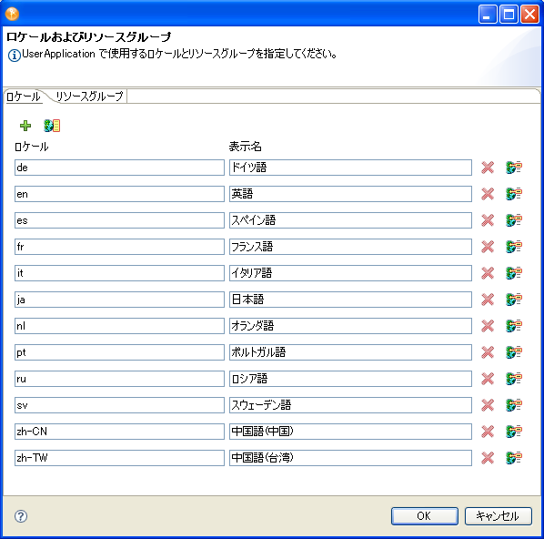 ユーザアプリケーションドライバでサポートされるロケールのリストに新しいロケールを追加します。ボタンをクリックすると、言語と国の入力を求められます。リストから選択するか、または値を入力できます。言語は必須で、ロケールとして表示されます。国は必須ではありません。 |