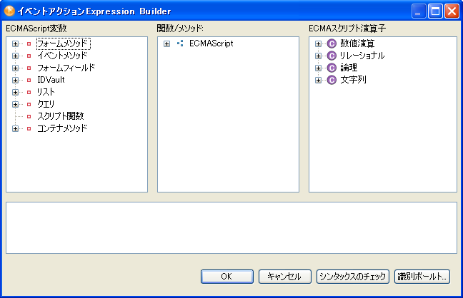 イベントアクションExpression Builderは、フォームアクションメソッドにもアクセスできます(左列を参照)。この列からは、ディレクトリ抽象化レイヤクエリオブジェクトとともにフォームアクションスクリプトAPIにもアクセスできます。フォームアクションスクリプトAPIはJavaScript*で作成されているので、条件、ループ、およびユーザ定義関数を追加できます。 フォームアクションAPIの詳細については、「セクション 10.3.1, フォームアクションスクリプトメソッド」を参照してください。JavaScriptライブラリをインポートまたは組み込むには、[フォームコントロール]エリアのタブを使用します。詳細については、セクション 6.3.4, [スクリプト]タブの使用を参照してください。