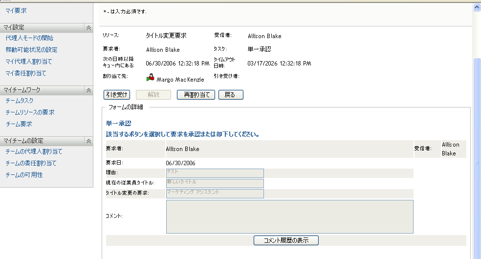図 6-1はリソース要求フォームの一例です。フォームの上部には、要求の詳細を表示した読み込み専用領域があります(承認フォームでは承認の詳細)。下部にあるセクションで、ユーザはリソース要求(または承認)に情報を入力し、何らかのアクションを行います。
