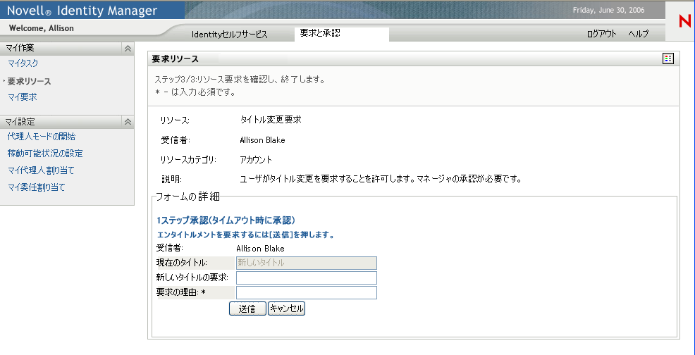 ユーザはフォームを使用して、リソースを要求し、リソース要求を承認し、タスクを処理できます。フォームは、ユーザがユーザアプリケーションのタブのカテゴリでアクションを選択するときに使用できます。URLから直接使用することもできます。この手法の詳細については、「セクション 6.9, フォームへの直接アクセス」を参照してください。