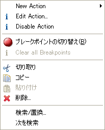 このメニューから、アクションの追加や編集(「セクション 9.5, アクション」を参照)、アクションモデル内のブレークポイントの切り替え(「アニメーション」を参照)、その他のタスクを実行できます。