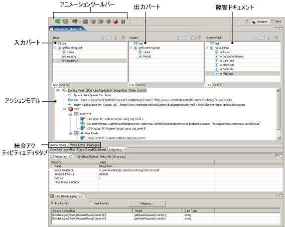 統合アクティビティエディタには、統合アクティビティの入力、出力、アクションのための作業環境が備わっています。統合アクティビティエディタは、アクションモデル、WSDLエディタ、メッセージの3つのビューで構成されています。
