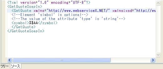 WSDLエディタには、WebサービスのWSDLドキュメントが表示されます。WSDLの編集は、ツリービューとソースビューの編集機能を使用して行えます(「ツリービュー」および「ソースビュー」を参照)。